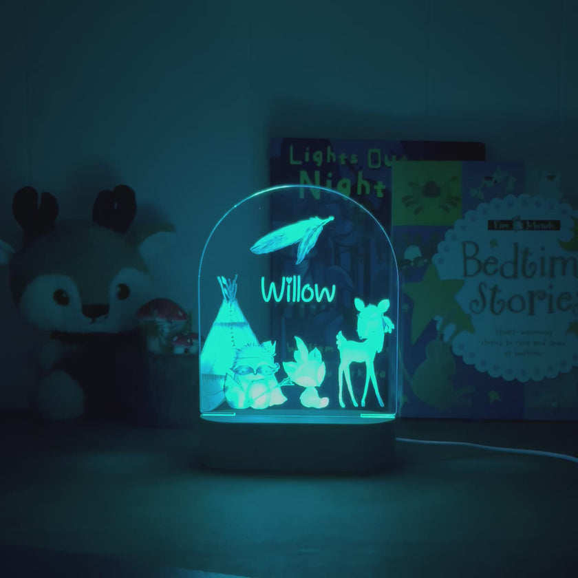 Add a spark of wonder and magic to your child's bedtime routine with the personalized Animals and a Teepee Night Light. This lamp features a teepee surrounded by friendly animal friends. It provides a gentle, warm glow that soothes nighttime fears and creates a peaceful atmosphere in any room. Its whimsical design encourages imagination and supports comforting bedtime rituals, helping children feel safe and relaxed as they drift off to sleep. This night light is a thoughtful, heartwarming gift that parents and children will treasure for years, making bedtime a comforting and magical experience night after night.
