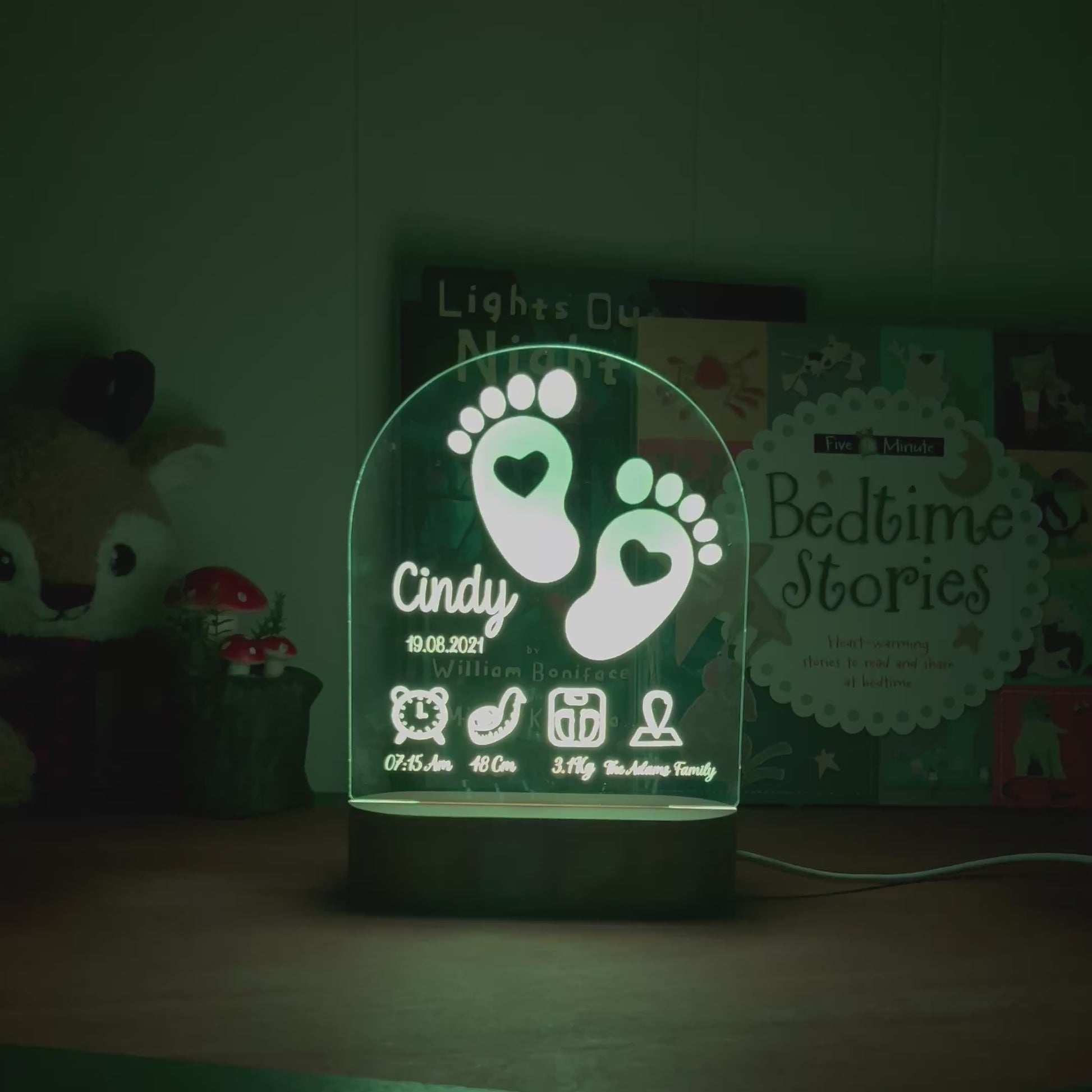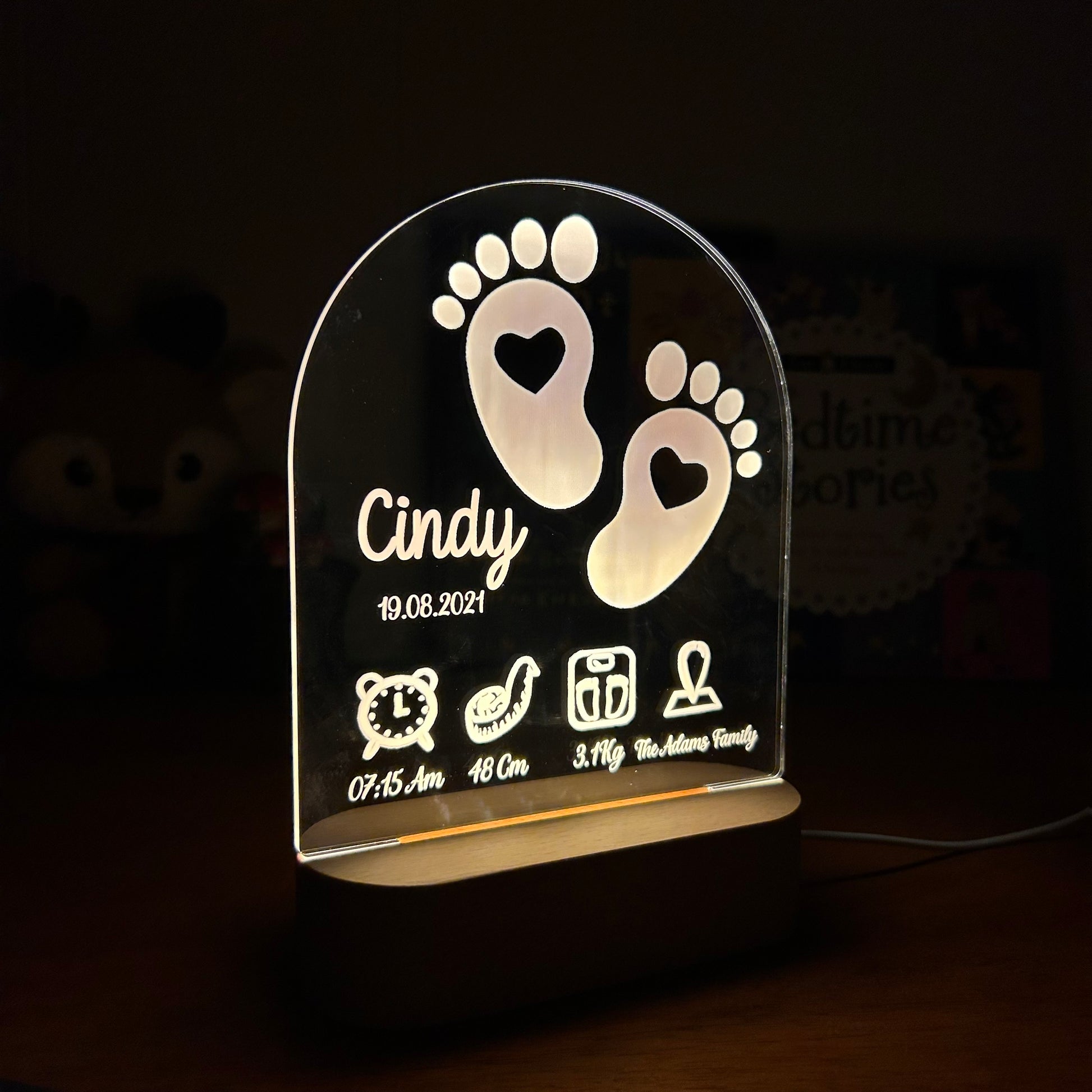 Make every bedtime a sweet reminder of your little one’s first moments with this timeless personalized night light. This lamp glows softly, displaying their name, birth date, and other birth details—turning memories into a warm, comforting glow. The gentle light soothes nighttime routines while adding a touch of love to the nursery. From middle-of-the-night feedings to storytime snuggles, it’s a beautiful way to keep those first-day memories close. This night light is a charming piece of nursery décor, and a treasure they’ll cherish for years to come.