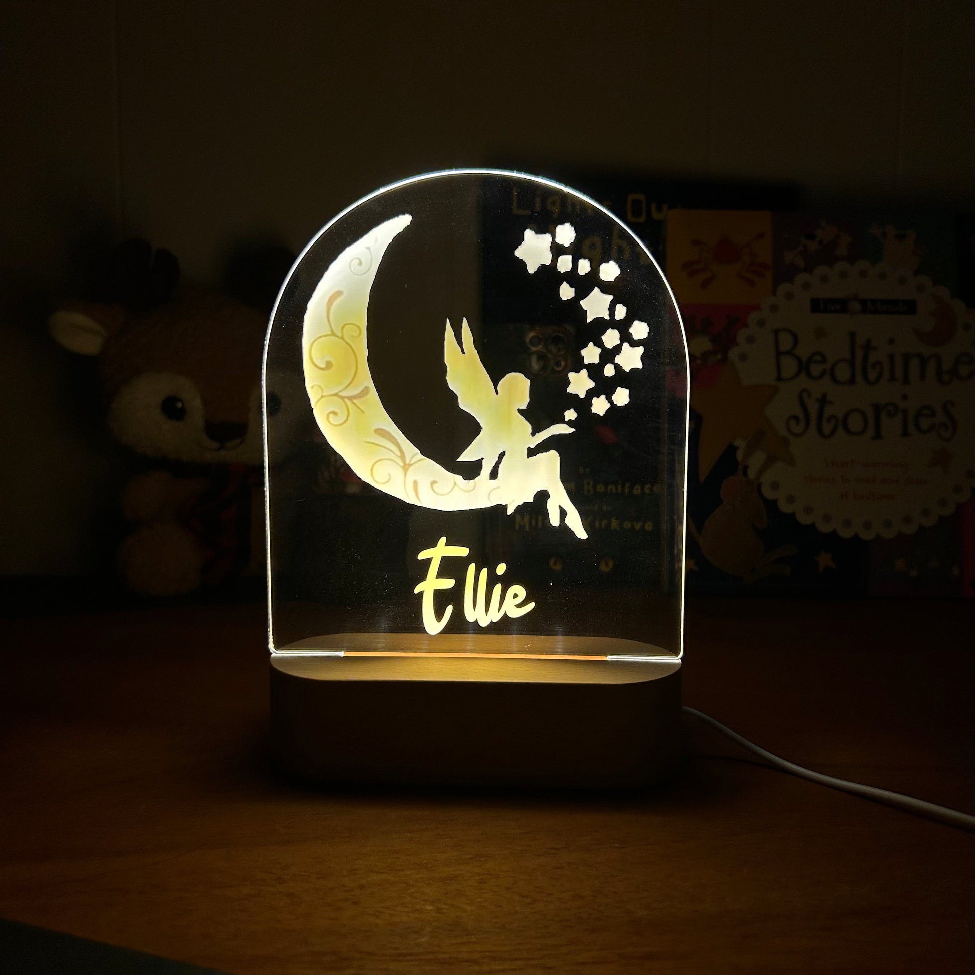 Let the fairy guide your little star into a peaceful sleep each night with this enchanting personalized Fairy Night Light. It features a fairy perched on a crescent moon, surrounded by twinkling stars. Whether placed on a nursery shelf or bedside table, it creates a setting that helps your little one feel safe and ready for dreamland. It is a magical companion for any child who loves fairy tales and gentle nighttime comfort, and is ideal as a baby shower gift, birthday gift, or a thoughtful addition to your little one's room.